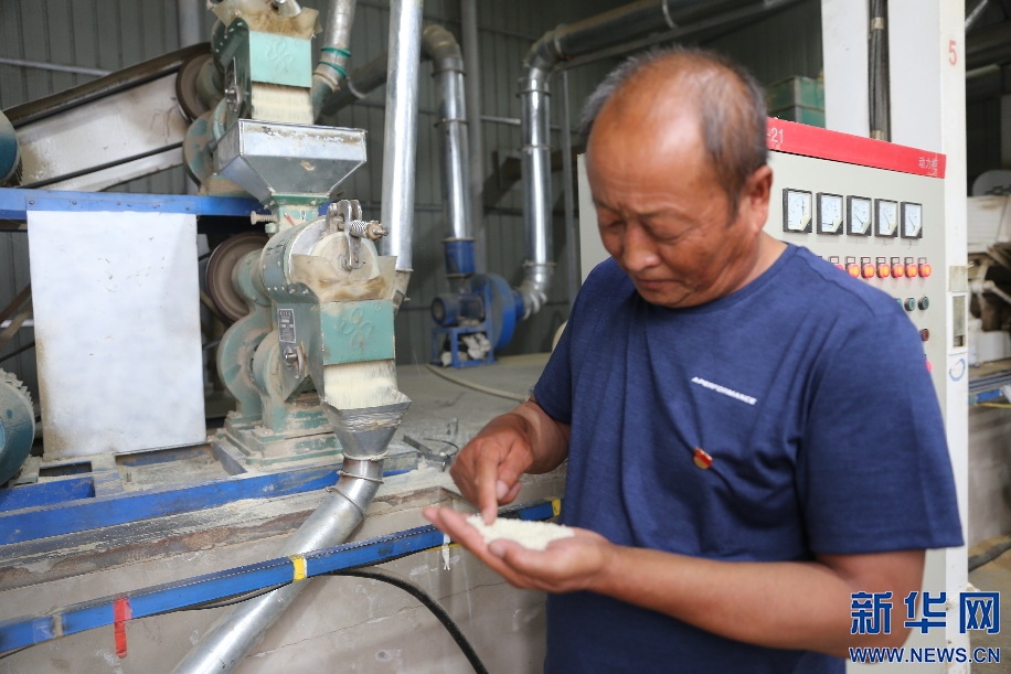 6月12日,內(nèi)蒙古自治區(qū)達(dá)拉特旗沙圪堵村農(nóng)民李清云在廠房里查看稻米加工情況。新華網(wǎng)曹楨攝