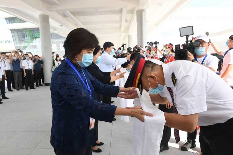 自治區(qū)黨委副書記、自治區(qū)主席布小林宣布赤喀高鐵正式開通運營,并與自治區(qū)副主席艾麗華、自治區(qū)政府秘書長包振玉以及中國鐵路沈陽局集團有限公司、蒙遼鐵路客運專線有限責(zé)任公司、赤峰市委負(fù)責(zé)同志一起為列車組人員敬獻哈達。
