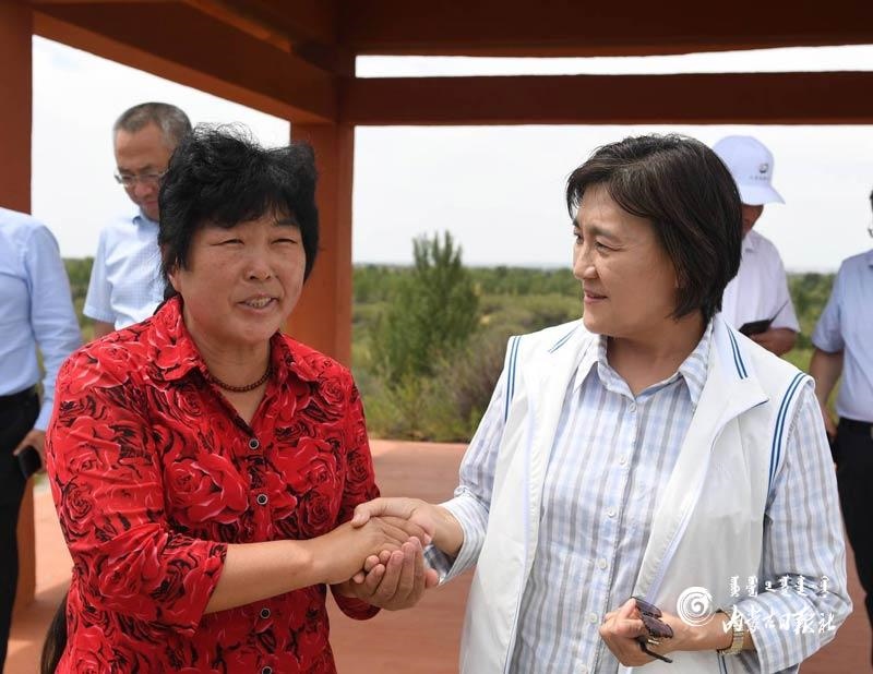 烏蘭陶勒蓋治沙站位于烏審旗毛烏素沙地腹部,建站40多年來,以治沙造林、保護(hù)森林資源為己任,一代接著一代干,防沙治沙工作取得了明顯成效。布小林來到烏蘭陶勒蓋治沙站,調(diào)研治沙造林工作,并與全國“三八·綠色獎?wù)隆鲍@得者殷玉珍親切交流,對當(dāng)?shù)厣鷳B(tài)治理的模式和成效給予肯定。她還來到伊金霍洛旗紅慶河鎮(zhèn),考察鄉(xiāng)村治理、消費扶貧等工作。