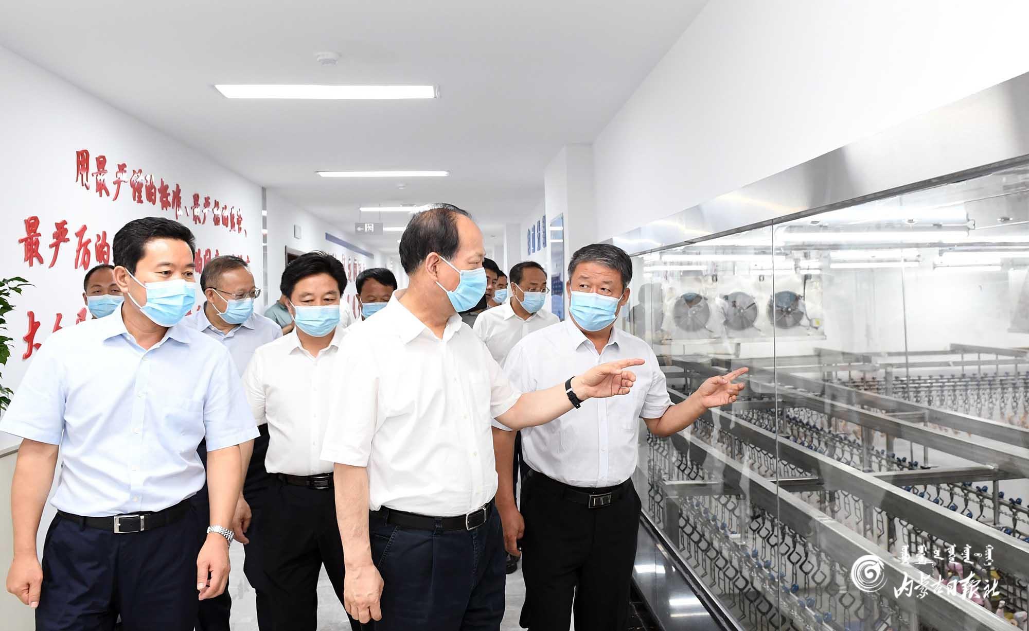 抓項(xiàng)目、興產(chǎn)業(yè)對于做好“六穩(wěn)”工作、落實(shí)“六?!比蝿?wù)至關(guān)重要。石泰峰走進(jìn)金伯利農(nóng)莊、草原宏寶食品公司、金麥提升農(nóng)機(jī)裝備制造公司、潤海源肉雞屠宰加工廠、天衡制藥公司等地,深入考察項(xiàng)目推進(jìn)、企業(yè)經(jīng)營、產(chǎn)業(yè)鏈建設(shè)、供應(yīng)鏈保障等情況。他指出,河套灌區(qū)發(fā)展現(xiàn)代農(nóng)牧業(yè)責(zé)任重大、潛力巨大,要堅(jiān)持生態(tài)優(yōu)先、綠色發(fā)展鮮明導(dǎo)向,堅(jiān)持一二三產(chǎn)業(yè)融合發(fā)展,學(xué)習(xí)先進(jìn)經(jīng)驗(yàn),更新發(fā)展理念,創(chuàng)新經(jīng)營模式,提升科技水平,著力推動(dòng)農(nóng)牧業(yè)向集約化、規(guī)模化、智能化、高端化方向發(fā)展,切實(shí)做好做足現(xiàn)代農(nóng)牧業(yè)這篇大文章。金草原現(xiàn)代養(yǎng)殖園飼養(yǎng)胡羊15萬只,智能化圈舍內(nèi)溫控、噴淋、全自動(dòng)飲水、電動(dòng)刮糞裝置一應(yīng)俱全,撒料、消毒等一鍵完成,舒緩的音樂縈繞耳邊。石泰峰指出,像這樣的現(xiàn)代化規(guī)模養(yǎng)殖,不僅能夠有效提高產(chǎn)業(yè)發(fā)展水平和帶動(dòng)農(nóng)牧民增收,而且有利于解決草畜平衡問題、減少自然放養(yǎng)對草原生態(tài)的影響,要革命性地變革養(yǎng)殖方式,用工業(yè)化的思維和方式推進(jìn)農(nóng)牧業(yè)發(fā)展,充分發(fā)揮龍頭企業(yè)的引領(lǐng)作用,不斷完善農(nóng)企利益聯(lián)結(jié)機(jī)制,實(shí)行標(biāo)準(zhǔn)化全流程管理,完善農(nóng)畜產(chǎn)品可追溯體系,推進(jìn)產(chǎn)加銷一體化發(fā)展,實(shí)現(xiàn)產(chǎn)品有市場、質(zhì)量有保證、農(nóng)牧民有收益、企業(yè)有效益。要精心謀劃推進(jìn)農(nóng)業(yè)和旅游融合發(fā)展,努力把河套大地的特色農(nóng)業(yè)種出好風(fēng)景、種出高效益。他強(qiáng)調(diào),時(shí)間就是金錢,時(shí)間不等人,各地區(qū)各有關(guān)部門要緊抓施工黃金期,加大力度、加快進(jìn)度推進(jìn)各類重點(diǎn)項(xiàng)目建設(shè),有關(guān)方面要全力幫助解決項(xiàng)目推進(jìn)中遇到的困難和問題,積極主動(dòng)做好服務(wù)保障工作,促進(jìn)項(xiàng)目早落地早達(dá)產(chǎn),帶動(dòng)就業(yè)、穩(wěn)定經(jīng)濟(jì)。
