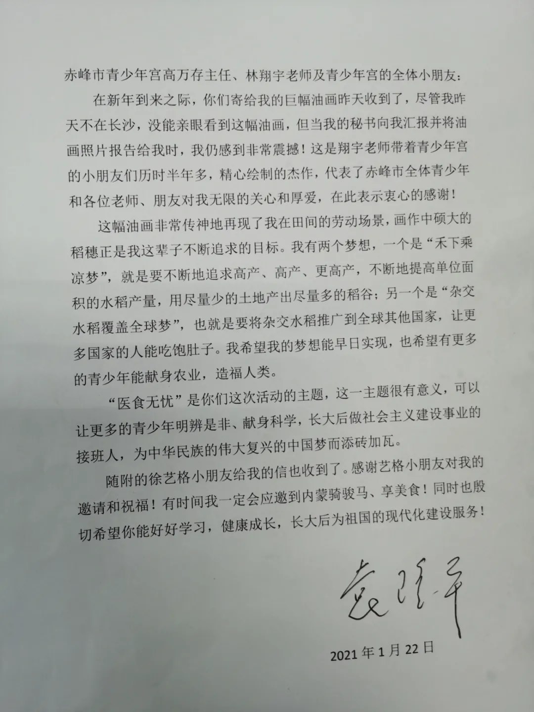 “袁隆平院士在百忙之中抽出寶貴時(shí)間給赤峰市青少年宮和孩子們回信,令我們始料未及,這封信我們反復(fù)讀了很多遍。深受感動(dòng)。”赤峰市青少年宮副主任高萬存深有感觸的說,90歲高齡的袁隆平院士依然孜孜不倦的追求自己的兩個(gè)夢(mèng)想,并一直在為之不懈的奮斗,這種崇高的精神品質(zhì)值得當(dāng)代青年學(xué)習(xí)。袁隆平院士在信中對(duì)赤峰市青少年宮推出的“醫(yī)食無憂”的主題教育活動(dòng)給予了充分肯定,并寄語赤峰市青少年好好學(xué)習(xí),長大后為祖國的現(xiàn)代化建設(shè)服務(wù),激勵(lì)著孩子們刻苦學(xué)習(xí),為夢(mèng)想努力拼搏,將來成為一名對(duì)社會(huì)有所貢獻(xiàn)的人。歡迎并期待袁隆平院士來內(nèi)蒙古品嘗美食,感受大草原的美麗風(fēng)光。