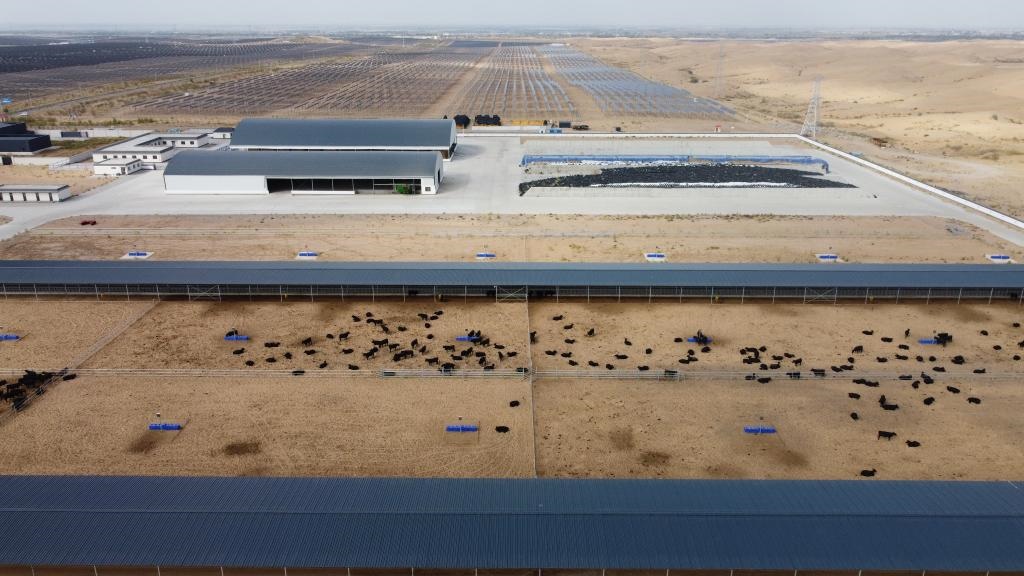 “這是我們在光伏基地打造的循環(huán)經(jīng)濟項目?!敝行罂萍加邢薰救馀?biāo)準(zhǔn)化養(yǎng)殖場負責(zé)人石龍說,養(yǎng)殖場肉牛產(chǎn)生的糞便可以作為光伏基地板間種植作物的肥料,改善沙地土質(zhì)的同時還能促進作物生長,而這些作物又能作為飼料供應(yīng)養(yǎng)殖場,循環(huán)發(fā)展的同時還能促進沙漠生態(tài)改善。