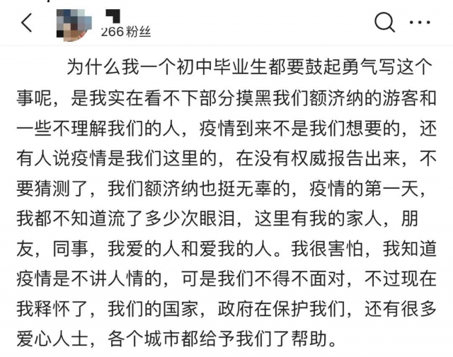 在社交媒體上,一名王姓女士通過短視頻呈現(xiàn)了一家人滯留額濟(jì)納的境況,在視頻中,她為同樣滯留在此的游客鼓勁:“如果你此時(shí)正在阿拉善,愿你如胡楊般堅(jiān)強(qiáng),積極應(yīng)對疫情?!边@條短視頻發(fā)出數(shù)小時(shí),就吸引了20余萬瀏覽量。