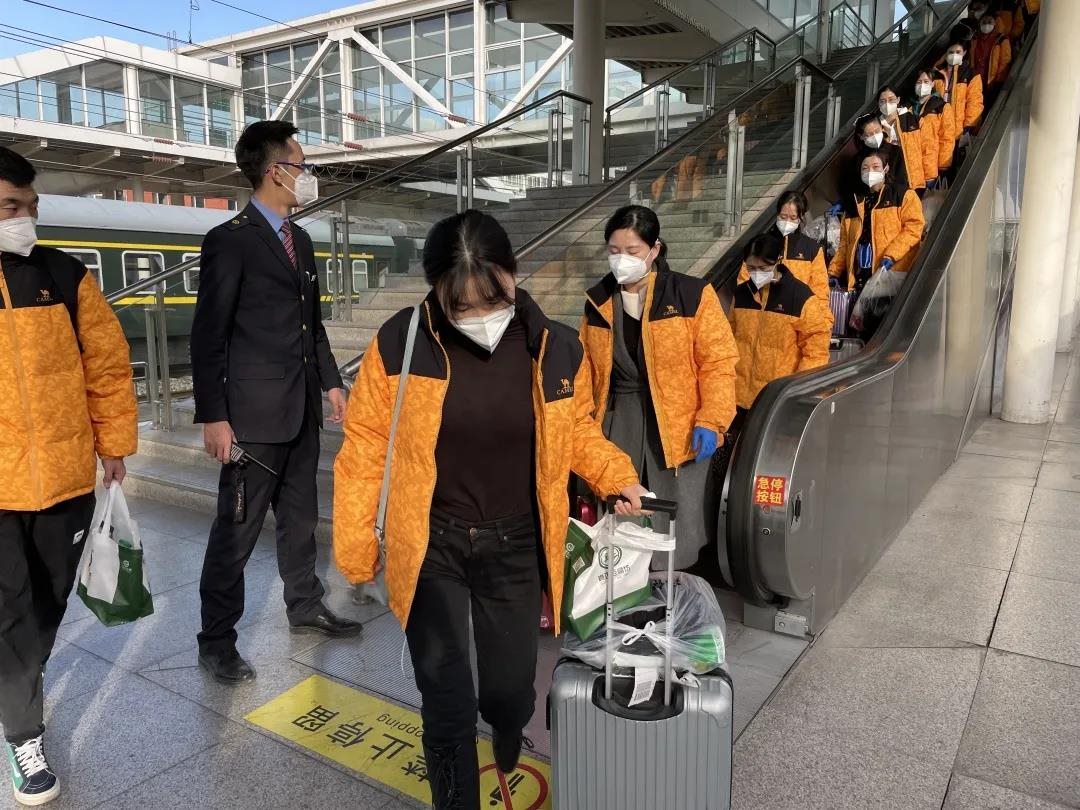 15時,車站工作人員引導醫(yī)務人員快速通過專用通道,開始登車。