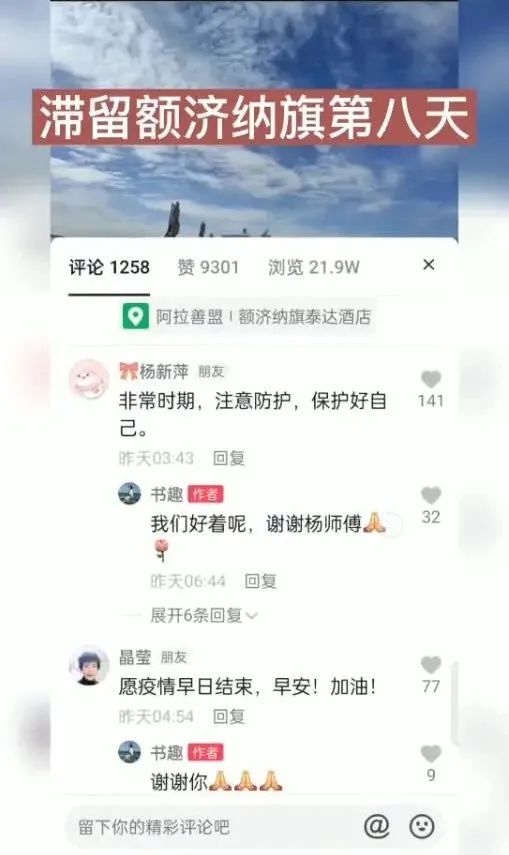 視頻發(fā)出數(shù)小時就吸引了上萬的瀏覽量。視頻發(fā)布者王女士在視頻中呈現(xiàn)一家人滯留額濟(jì)納旗現(xiàn)況的同時,也給和她同樣滯留額濟(jì)納旗的近萬名游客鼓勁:“如果你此時正在阿拉善,愿你如胡楊般堅(jiān)強(qiáng),積極應(yīng)對疫情?!?/p>