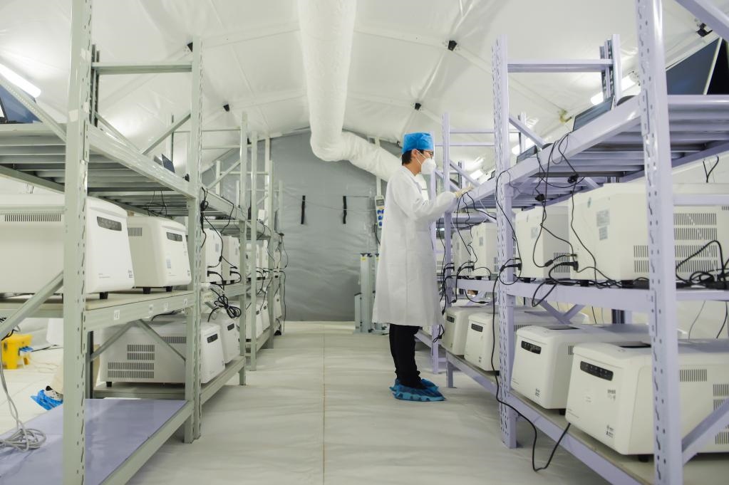 12月3日,工作人員在“獵鷹號”硬氣膜實驗室進(jìn)行核酸檢測。新華社記者達(dá)日罕 攝