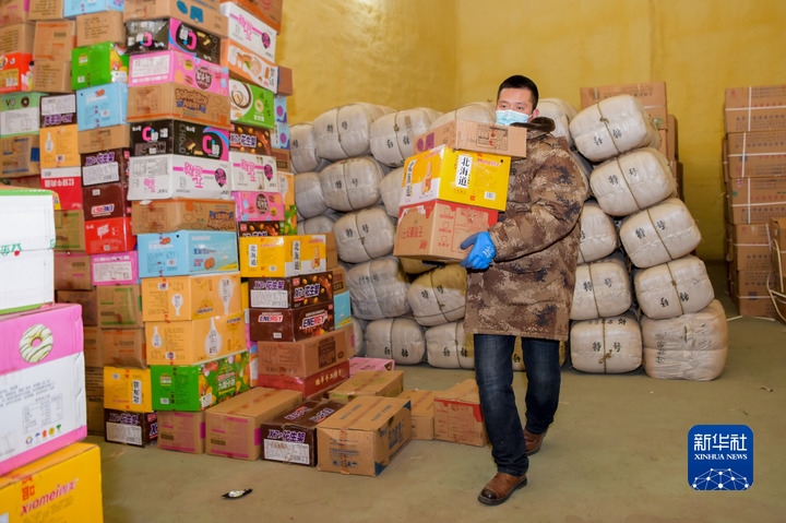 12月7日,在滿洲里市一物資儲(chǔ)備庫(kù),工作人員王永亮在搬運(yùn)物資。新華社記者魏婧宇 攝
