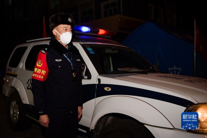 深夜安靜的街道上亮起了兩盞車燈,燈光中是正在巡邏的滿洲里市公安局道南派出所民警王滿。王滿和同事負(fù)責(zé)新世界小區(qū)B區(qū)的外圍管控工作,看到街邊有商鋪亮著燈,他站在門外大聲叮囑里面的人千萬(wàn)不能出門,同事在他身后幾米處用車燈給他照明。
