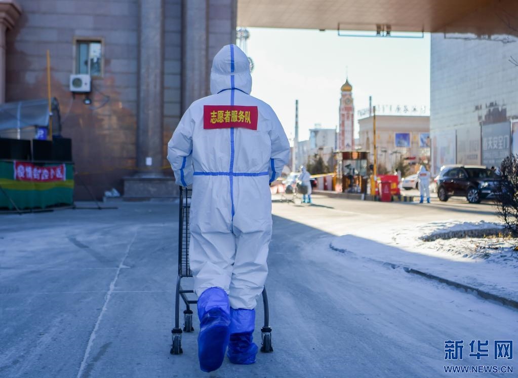 12月5日,在滿洲里市尚都國際小區(qū),志愿者為居民送物資。新華社記者 李志鵬攝