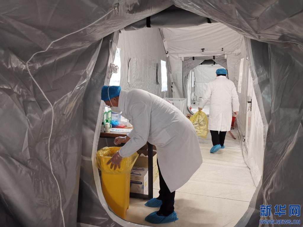 12月3日,志愿者在“獵鷹號”硬氣膜實驗室內清理垃圾。新華社記者 魏婧宇 攝
