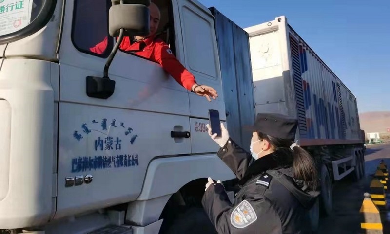 在巴彥淖爾市烏拉特中旗牧羊海疫情防控服務點,工作人員正對來往的車輛人員進行檢測、掃碼、詢問、登記……