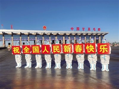 1月31日,民警在甘其毛都口岸貨運通道祝全國人民新春快樂。春節(jié)期間,內蒙古甘其毛都出入境邊防檢查站民警堅守一線,為出入境車輛提供優(yōu)質高效的通關服務,守護萬家燈火。(記者 孟和朝魯 通訊員 宋緒明 攝)