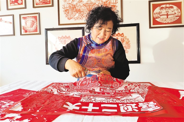 10月15日下午,自治區(qū)非遺剪紙項目傳承人、呼和浩特市土默特左旗畢克齊鎮(zhèn)紅秀剪紙合作社發(fā)起人李還秀在創(chuàng)作慶祝黨的二十大勝利召開系列剪紙作品。連日來,全區(qū)各地群眾通過剪紙、書法等藝術形式,表達對盛會的期盼、對祖國的祝福。記者 鄭學良 實習生 郭亞麗 攝