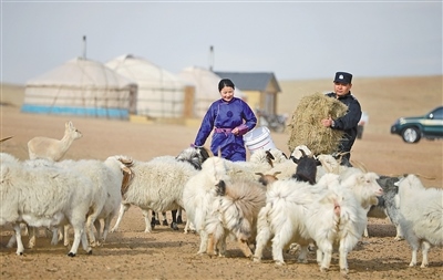 內(nèi)蒙古出入境邊防檢查總站達日罕烏拉邊境派出所民警幫助轄區(qū)牧民喂羊。記者馬建荃攝