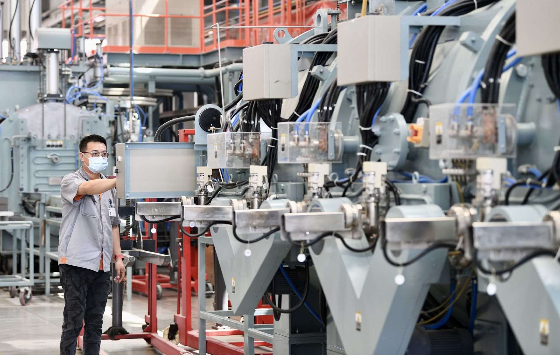 在包頭市稀土高新區(qū)大地熊(包頭)永磁科技有限公司生產(chǎn)車(chē)間內(nèi),技術(shù)人員查看設(shè)備運(yùn)行情況。