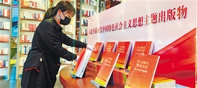 5月4日,內(nèi)蒙古新華書店工作人員整理擺放《牢記囑托感恩奮進(jìn)——五大任務(wù)干部讀本》。牟野攝
