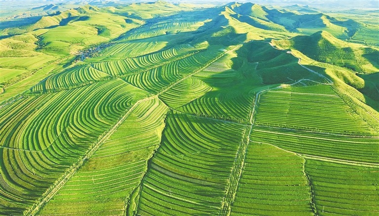 如今,薩力巴萬(wàn)畝梯田、豐收萬(wàn)畝梯田、新地萬(wàn)畝梯田在敖漢旗大地依次呈現(xiàn),全旗梯田保存面積達(dá)120萬(wàn)畝,將中部丘陵地區(qū)“雞爪子溝”劃出的貧窮“等高線”變作群山出金、河流淌銀的“米糧川”。