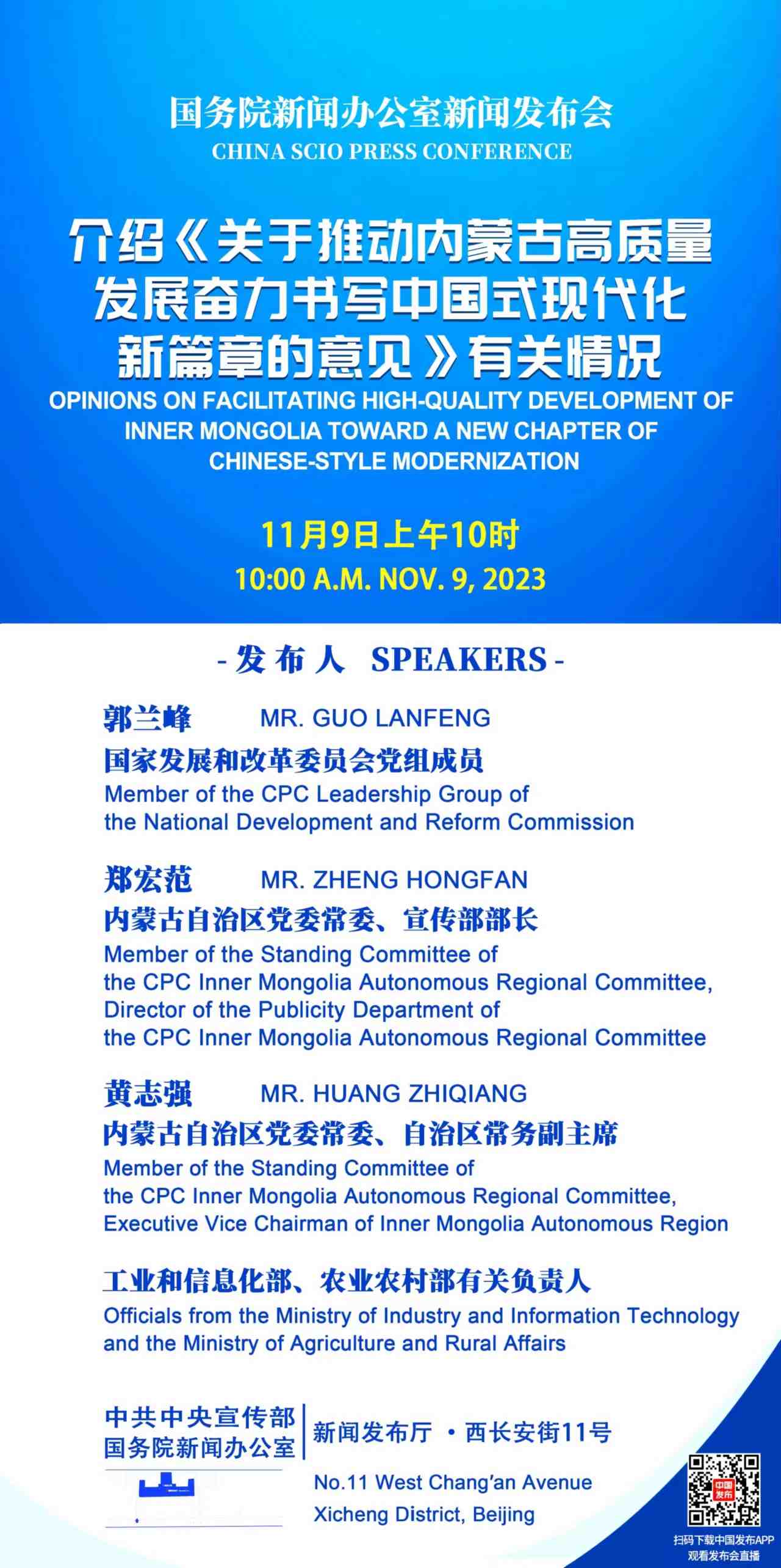 2023年11月9日(星期四)上午10時,國務院新聞辦公室舉行新聞發(fā)布會,請國家發(fā)展和改革委員會黨組成員郭蘭峰,內蒙古自治區(qū)黨委常委、宣傳部部長鄭宏范,內蒙古自治區(qū)黨委常委、自治區(qū)常務副主席黃志強和工業(yè)和信息化部、農業(yè)農村部有關負責人介紹《關于推動內蒙古高質量發(fā)展奮力書寫中國式現(xiàn)代化新篇章的意見》有關情況,并答記者問。