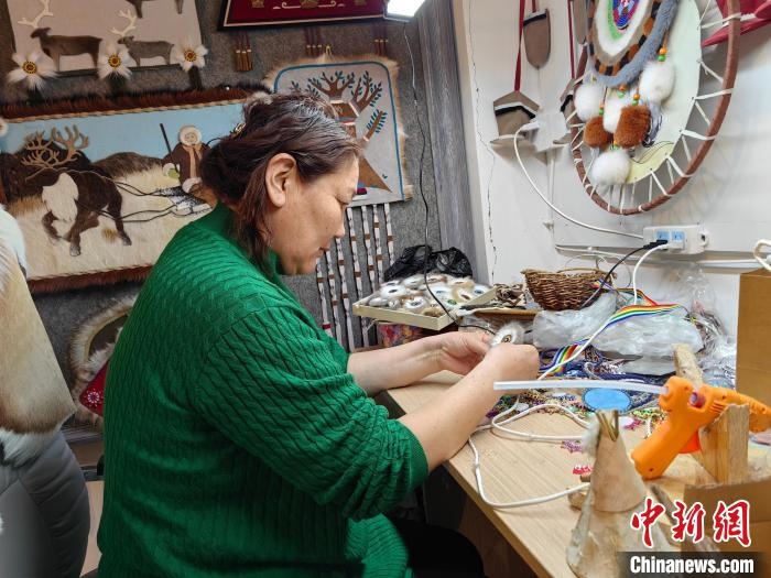 2月21日,在內蒙古呼倫貝爾市鄂溫克族自治旗一家手工藝品工作室內,烏仁在制作太陽花手工藝品。 于嘉 攝