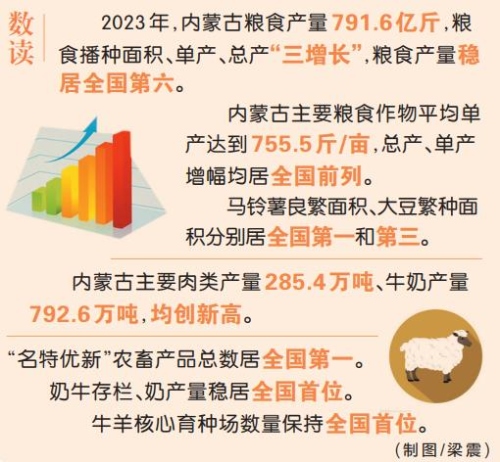 數(shù)字是發(fā)展最好的注腳。過去一年,內(nèi)蒙古緊扣“地、水、種”和“糧、肉、奶”6個重點,全力推動糧食單產(chǎn)再提高、牲畜養(yǎng)殖再增效,不斷擴(kuò)大數(shù)量、提高質(zhì)量、增加產(chǎn)量,努力把國家重要農(nóng)畜產(chǎn)品生產(chǎn)基地建設(shè)得量大質(zhì)優(yōu),切實當(dāng)好國家糧食安全“壓艙石”。