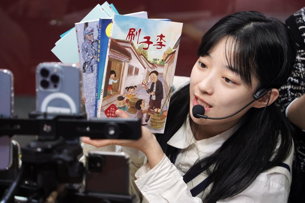??1月11日,一名主播在2024北京圖書(shū)訂貨會(huì)直播推介圖書(shū)。新華社記者 潘旭 攝