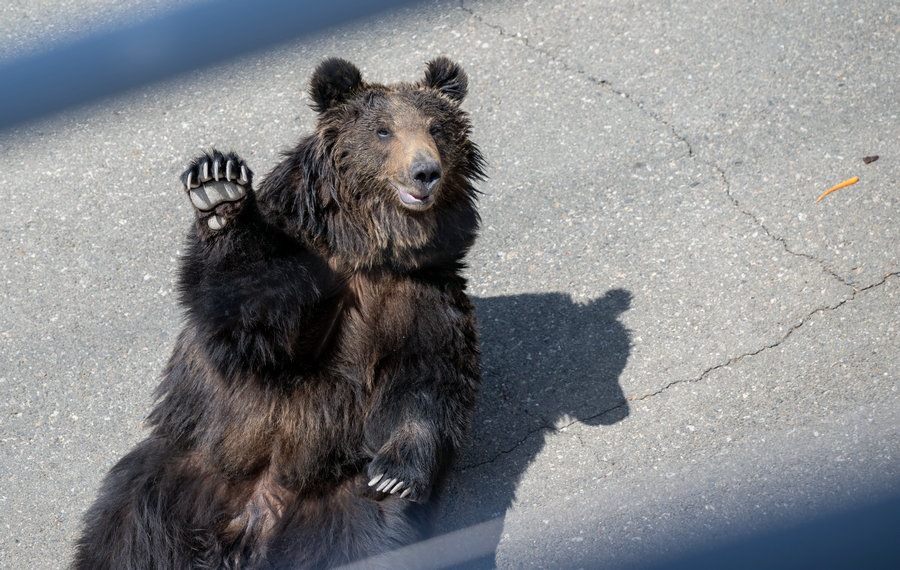 動(dòng)物園里向游客打招呼的棕熊