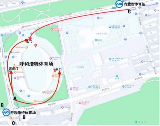 由呼和浩特體育場站A口、D口出站,沿氣象局西路向北直行可抵達(dá)呼和浩特體育場西門安檢處。