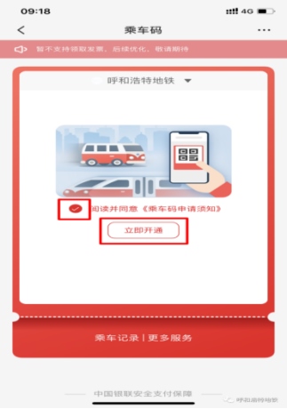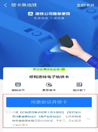 首次使用先進(jìn)行“同意協(xié)議并領(lǐng)卡”并領(lǐng)取“呼和浩特電子地鐵卡”。