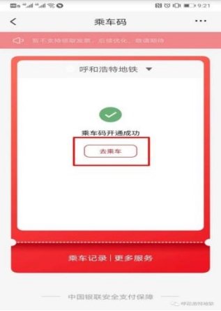 開通成功后,點擊“去乘車”獲取乘車二維碼,在進(jìn)、出閘機(jī)對應(yīng)區(qū)域掃描二維碼即可。