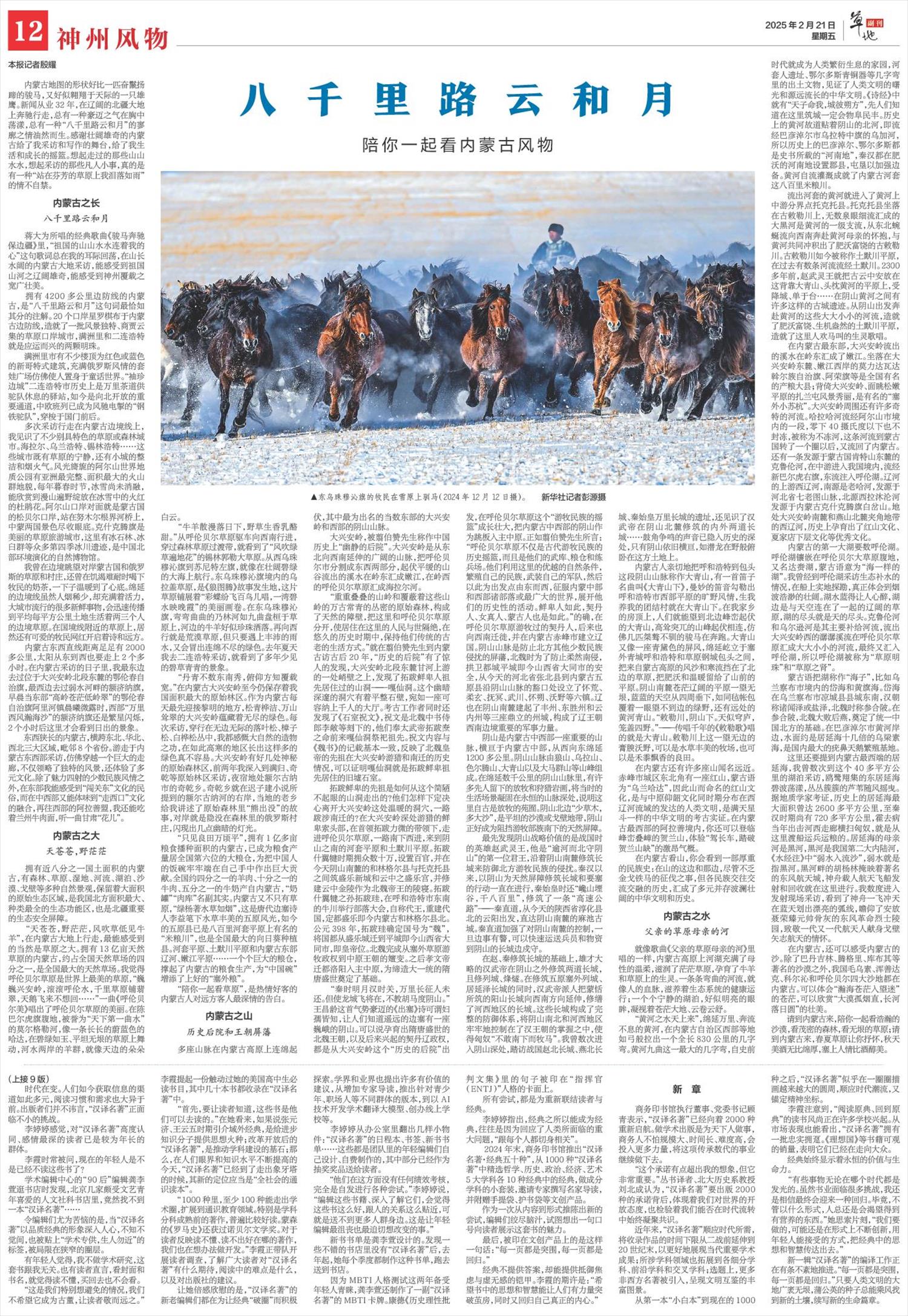 2025年2月21日《新華每日電訊》第12版整版刊發(fā)了《八千里路云和月 陪你一起看內(nèi)蒙古風物》的文章,新聞從業(yè)32年,作者在遼闊的北疆大地上奔馳行走,感悟到內(nèi)蒙古的壯闊雄奇無處不在,一種“八千里路云和月”的寥廓之情油然而生。