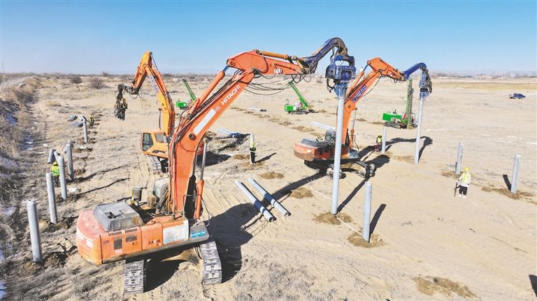 引孔機、打樁機轟鳴聲不絕于耳,打樁機將一根根水泥樁“釘”入地面中……連日來,巴彥淖爾市臨河區(qū)新華林場防沙治沙和光伏一體化項目施工現(xiàn)場多臺作業(yè)車輛同時進行樁基作業(yè),現(xiàn)場還不時有工作人員對打樁等基礎(chǔ)工作進行抽檢抽查,確保施工質(zhì)量。