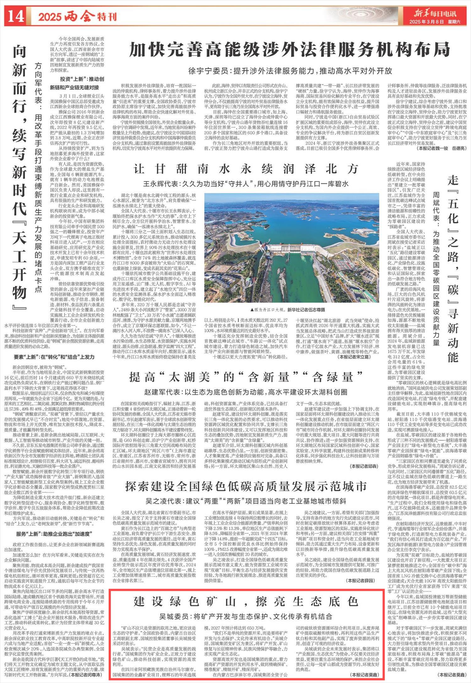 2025年3月8日,《新華每日電訊》第14版刊發(fā)題為《建設(shè)綠色礦山,擦亮生態(tài)底色》的消息,報道了吳城委員介紹,“我們不是單純的資源開采,而是要將礦產(chǎn)開發(fā)與生態(tài)保護(hù)、文化傳承有機(jī)結(jié)合?!?/p>