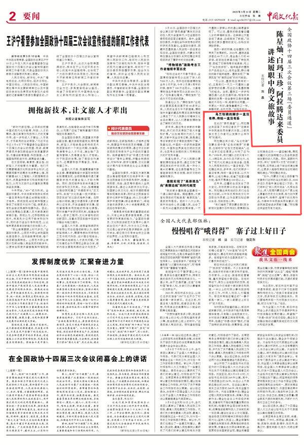 2025年3月11日,《中國文化報》第2版刊發(fā)了《烏蘭牧騎的腳步一直沒有停,傳統(tǒng)一直沒有丟》的文章,報道了3月10日,全國政協(xié)十四屆三次會議第三場“委員通道”集體采訪活動在人民大會堂舉行,其中,全國政協(xié)委員、內(nèi)蒙古蘇尼特左旗烏蘭牧騎隊(duì)長阿拉騰達(dá)來在現(xiàn)場講述了履職中的文旅故事。