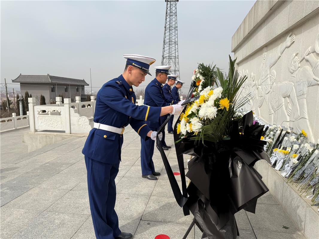 烏蘭察布市豐鎮(zhèn)市消防救援大隊工作人員向烈士紀(jì)念碑敬獻(xiàn)花籃。