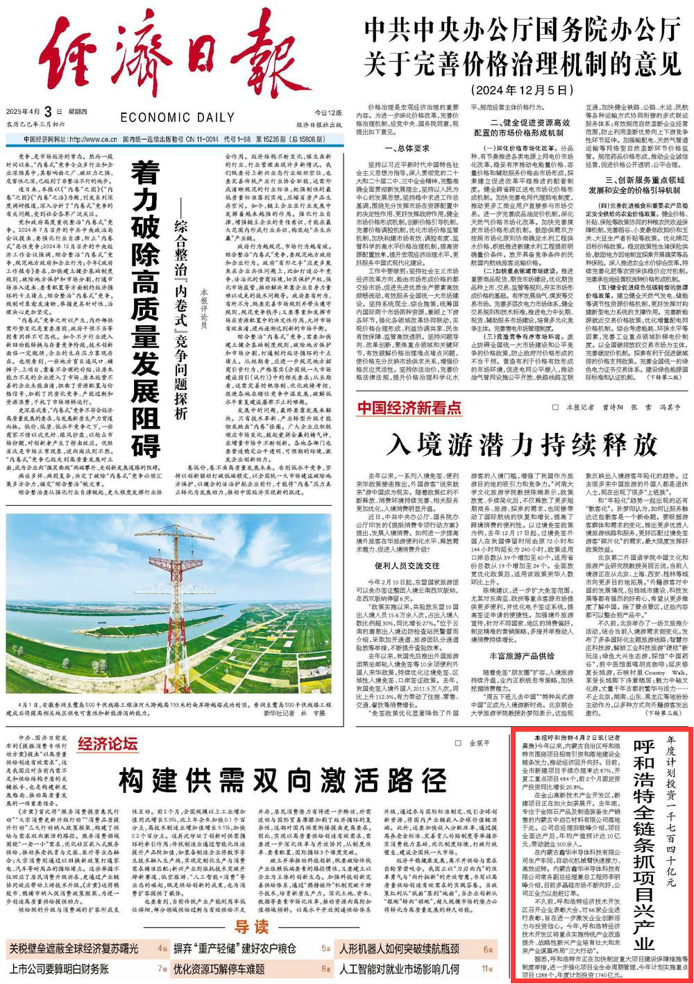 2025年4月3日,《經(jīng)濟(jì)日報》第1版刊發(fā)題為《年度計劃投資一千七百四十億元 呼和浩特全鏈條抓項(xiàng)目興產(chǎn)業(yè)》的文章,報道了今年以來,內(nèi)蒙古自治區(qū)呼和浩特市圍繞項(xiàng)目招商引資和落地建設(shè)全鏈條發(fā)力,推動經(jīng)濟(jì)回升向好。