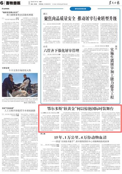 2025年4月7日,《農(nóng)民日?qǐng)?bào)》第6版刊發(fā)題為《鄂爾多斯“軟黃金”何以驚艷國際時(shí)裝舞臺(tái)》的文章,報(bào)道了日前,在上海舉行的一場國際時(shí)裝品牌慶典上,來自內(nèi)蒙古鄂爾多斯市阿爾巴斯山羊絨驚艷亮相,受到國內(nèi)外客商追捧。該羊絨憑借卓越品質(zhì)斬獲慶典"年度最佳羊絨大獎(jiǎng)",成為全球唯一獲此殊榮的產(chǎn)品。