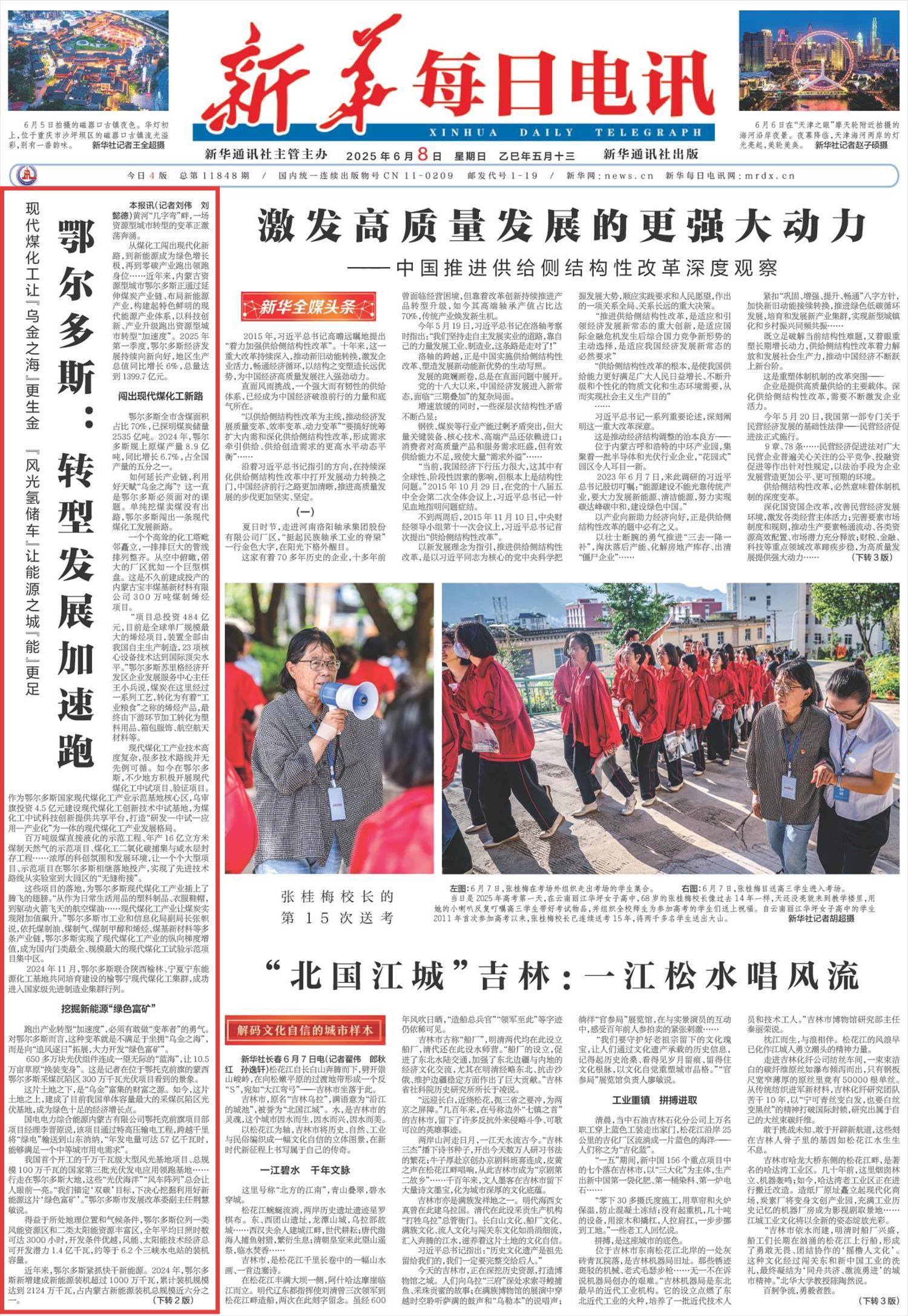 2025年6月8日,《新華每日電訊》第1版刊發(fā)題為《鄂爾多斯:轉(zhuǎn)型發(fā)展加速跑》一文,報(bào)道了近年來(lái),內(nèi)蒙古資源型城市鄂爾多斯正通過(guò)延伸煤炭產(chǎn)業(yè)鏈、布局新能源產(chǎn)業(yè),構(gòu)建起特色鮮明的現(xiàn)代能源產(chǎn)業(yè)體系,以科技創(chuàng)新、產(chǎn)業(yè)升級(jí)跑出資源型城市轉(zhuǎn)型“加速度”。