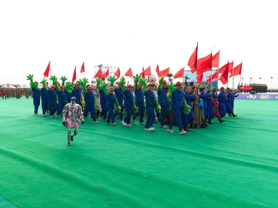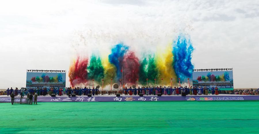 2025阿拉善那達慕開幕式現(xiàn)場,舞臺上五彩煙霧升騰