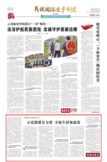 2025年9月23日,《中國民族報(bào)》第4版刊發(fā)題為《內(nèi)蒙古巴彥淖爾市:示范創(chuàng)建有力度 幸福生活加溫度》的文章,報(bào)道了2023年6月,習(xí)近平總書記在內(nèi)蒙古自治區(qū)考察調(diào)研時(shí),首次提出“鑄牢中華民族共同體意識是新時(shí)代黨的民族工作的主線,也是民族地區(qū)各項(xiàng)工作的主線”。巴彥淖爾市始終牢記囑托,將“鑄牢”貫穿于想問題、作決策、干工作的全過程。
