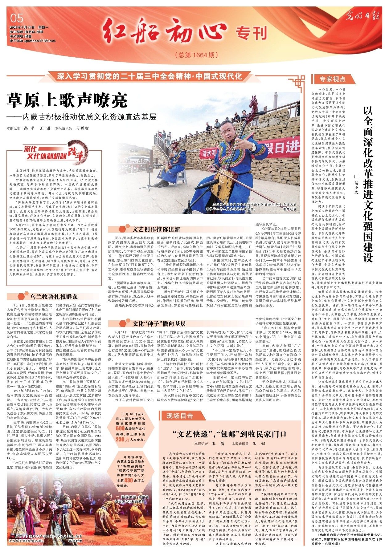2025年7月14日,《光明日?qǐng)?bào)》第5版刊發(fā)題為《草原上歌聲嘹亮——內(nèi)蒙古積極推動(dòng)優(yōu)質(zhì)文化資源直達(dá)基層》的文章,報(bào)道了盛夏時(shí)節(jié),地處祖國北疆的內(nèi)蒙古,千里草原綠浪如茵。一場(chǎng)場(chǎng)藝術(shù)盛宴連續(xù)登場(chǎng),賦予了草原更多魅力、更強(qiáng)活力。
