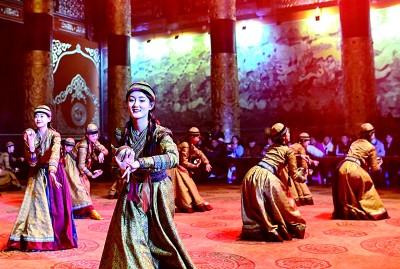 在鄂爾多斯文化產(chǎn)業(yè)園景區(qū)沉浸式劇場(chǎng),演員表演實(shí)景劇《鳳鳴九曲》。新華社發(fā)