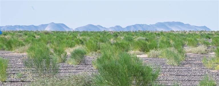 “這里是內(nèi)蒙古阿拉善盟西部荒漠綜合治理項目(二期)額濟納河片區(qū),是內(nèi)蒙古深入貫徹落實國家生態(tài)戰(zhàn)略、打贏河西走廊—塔克拉瑪干沙漠邊緣阻擊戰(zhàn)關(guān)鍵戰(zhàn)場之一。我們在這里人工種草6萬畝,現(xiàn)在已經(jīng)全部完成栽種,正在進行養(yǎng)護工作?!鳖~濟納河片區(qū)負(fù)責(zé)人關(guān)新偉介紹,項目由阿拉善盟林業(yè)和草原局推進,中國建筑一局有限公司、中鐵四局集團有限公司等承建,額濟納旗林業(yè)和草原局為項目建設(shè)提供技術(shù)支撐。