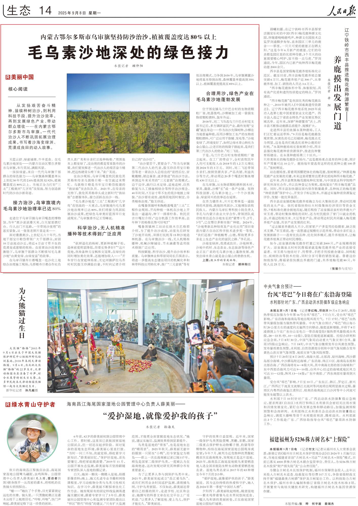 2025年9月8日《人民日?qǐng)?bào)》第14版刊發(fā)了《內(nèi)蒙古鄂爾多斯市烏審旗堅(jiān)持防沙治沙,植被覆蓋度達(dá)80%以上 毛烏素沙地深處的綠色接力》的文章,報(bào)道了在內(nèi)蒙古鄂爾多斯市烏審旗,一代代治沙人不斷鞏固拓展治理成果,書(shū)寫(xiě)著沙海變綠洲、荒漠成良田的動(dòng)人故事。沙地林果、沙地中藥材、生態(tài)農(nóng)業(yè)、生態(tài)旅游等綠色產(chǎn)業(yè)正在廣袤的毛烏素沙地上蓬勃發(fā)展,煥發(fā)出綠水青山就是金山銀山的勃勃生機(jī)。