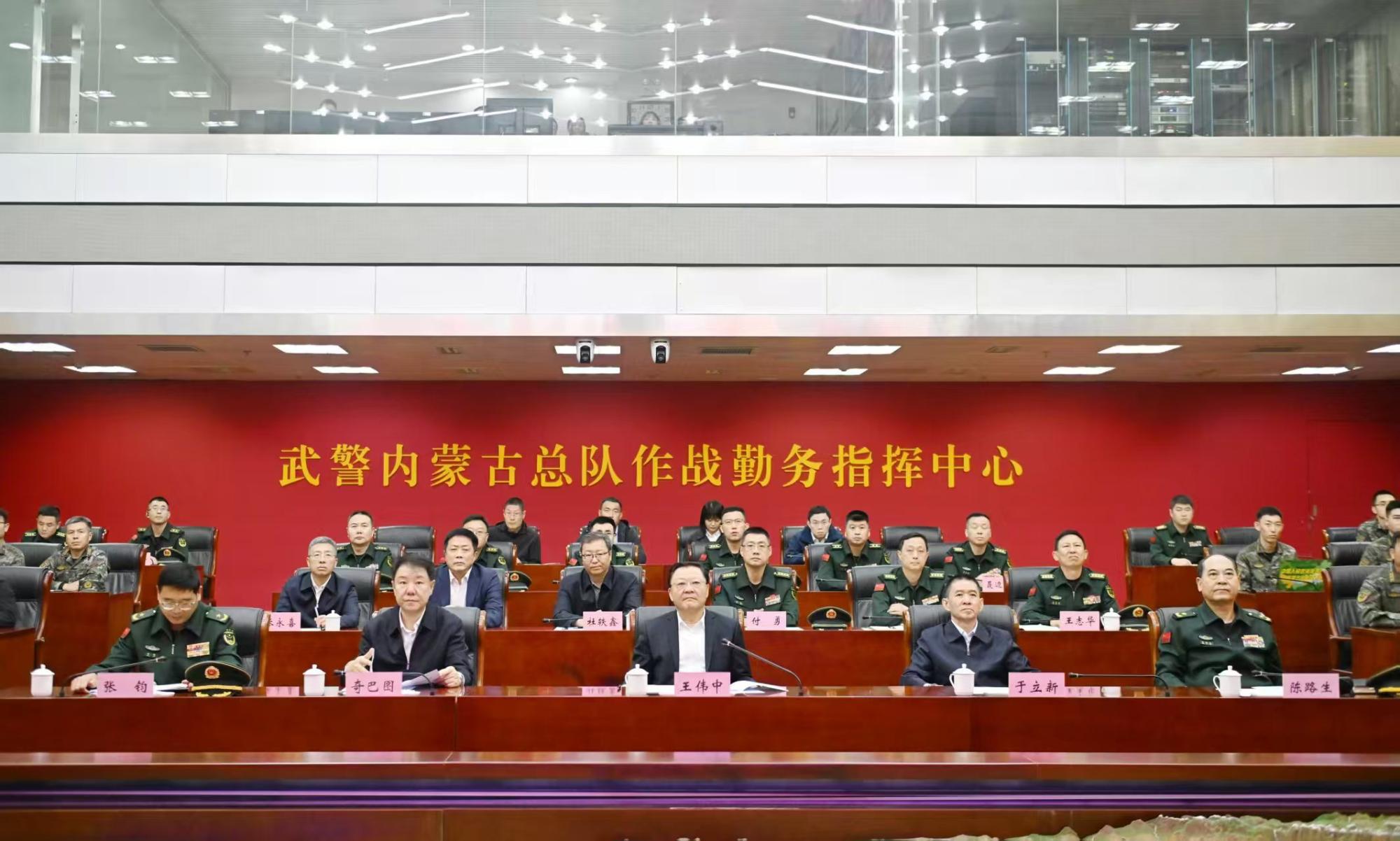 在武警內(nèi)蒙古總隊,王偉中來到作戰(zhàn)勤務(wù)指揮中心,仔細(xì)聽取部隊建設(shè)和指揮中心運行情況介紹。他指出,武警內(nèi)蒙古總隊是一支有著光榮歷史的英雄部隊,希望部隊繼續(xù)關(guān)心支持自治區(qū)經(jīng)濟社會發(fā)展,加強練兵備戰(zhàn),做好應(yīng)急準(zhǔn)備,當(dāng)好內(nèi)蒙古高質(zhì)量發(fā)展和長治久安的堅強基石、忠誠衛(wèi)士,為全區(qū)社會大局穩(wěn)定和人民群眾安居樂業(yè)保駕護(hù)航。
