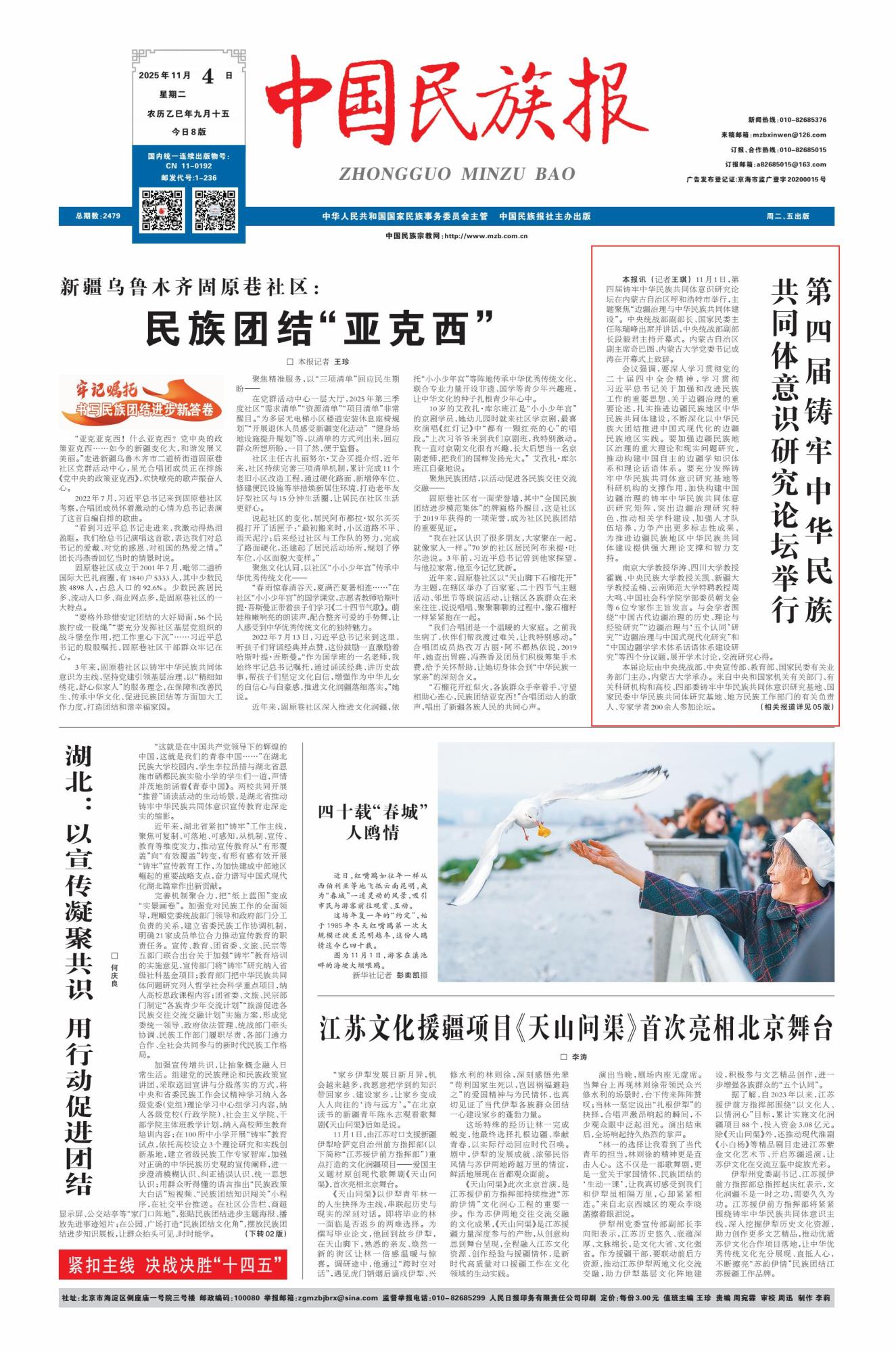 2025年11月4日,《中國民族報》頭版刊發(fā)題為《第四屆鑄牢中華民族共同體意識研究論壇舉行》的文章,報道了第四屆鑄牢中華民族共同體意識研究論壇于11月1日在內(nèi)蒙古自治區(qū)呼和浩特市舉行,主題聚焦“邊疆治理與中華民族共同體建設(shè)”。
