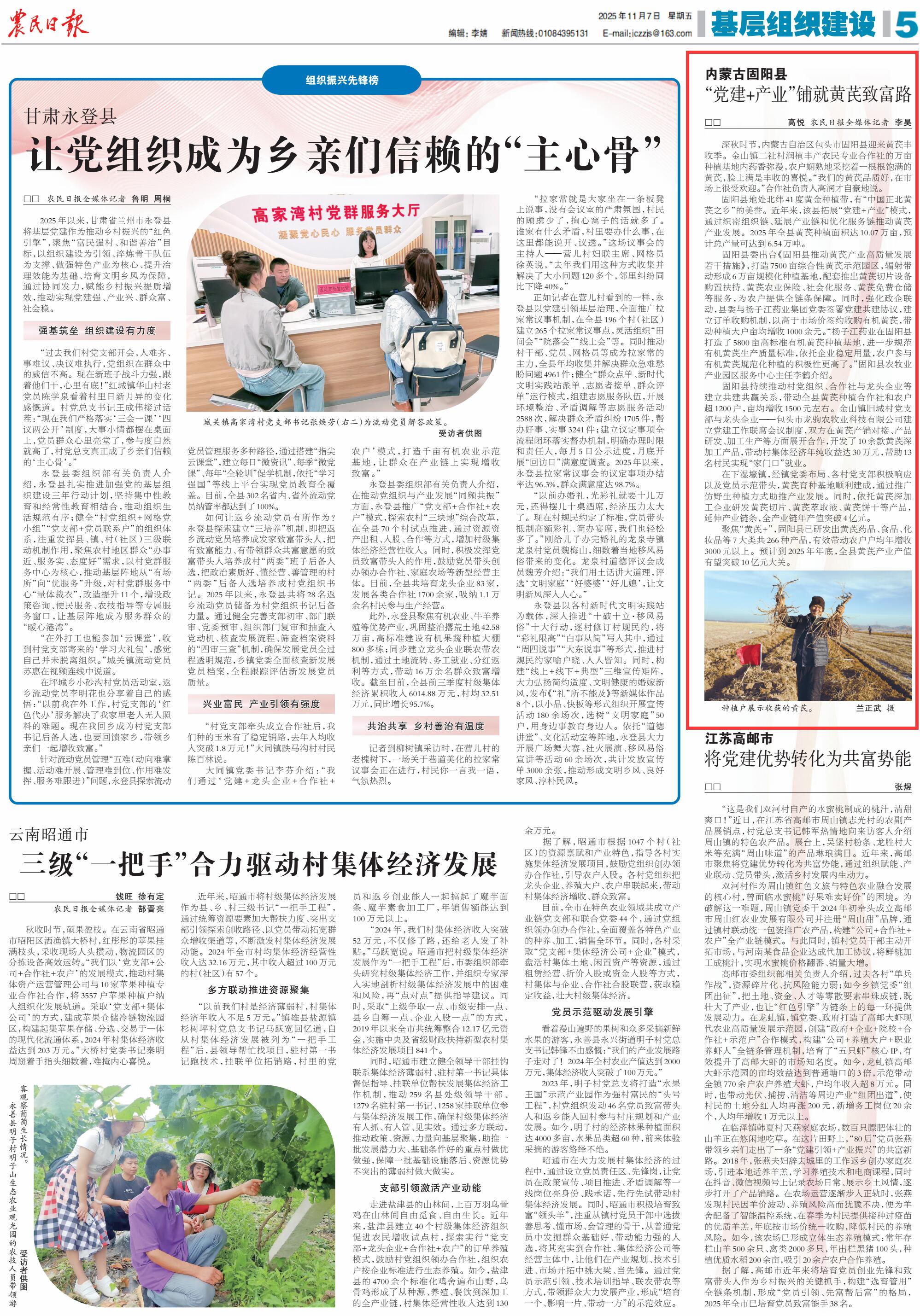 2025年11月7日《農(nóng)民日報(bào)》第5版刊發(fā)了《內(nèi)蒙古固陽縣“黨建+產(chǎn)業(yè)”鋪就黃芪致富路》的文章,報(bào)道了近年來,內(nèi)蒙古自治區(qū)包頭市固陽縣拓展“黨建+產(chǎn)業(yè)”模式,通過織密組織鏈、延展產(chǎn)業(yè)鏈和優(yōu)化服務(wù)鏈推動(dòng)黃芪產(chǎn)業(yè)發(fā)展。有效帶動(dòng)農(nóng)戶戶均年增收3000元以上。預(yù)計(jì)到2025年年底,全縣黃芪產(chǎn)業(yè)產(chǎn)值有望突破10億元大關(guān)。