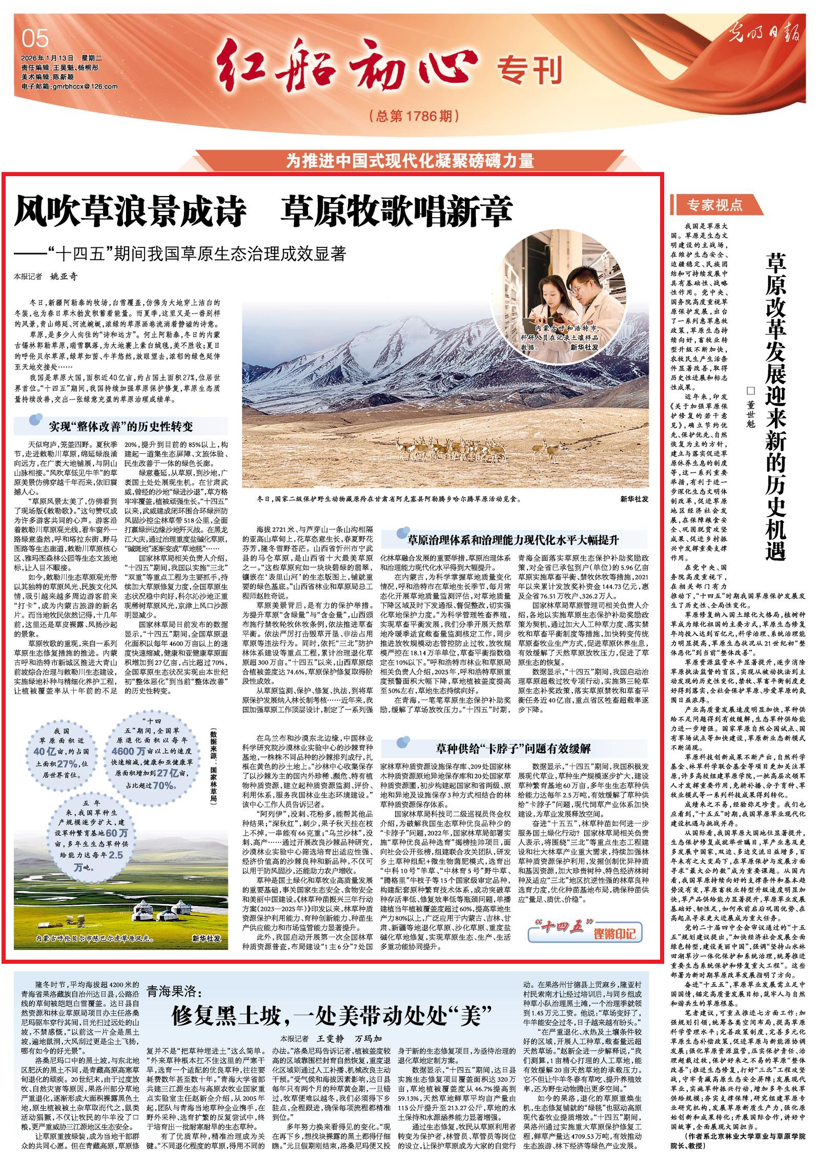 2026年1月13日,《光明日報》5版刊發(fā)題為《風吹草浪景成詩 草原牧歌唱新章——“十四五”期間我國草原生態(tài)治理成效顯著》的文章,報道了“十四五”期間,我國持續(xù)加強草原保護修復,草原生態(tài)質(zhì)量持續(xù)改善,交出一張綠意充盈的草原治理成績單。