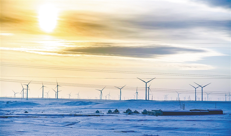 湛藍天幕之下,150座白色風車如鋼鐵巨人般巍然矗立,巨大的風機葉片迎風轉(zhuǎn)動,劃破長風,發(fā)出低沉而均勻的呼嘯,與天地間的遼闊寂靜共鳴。