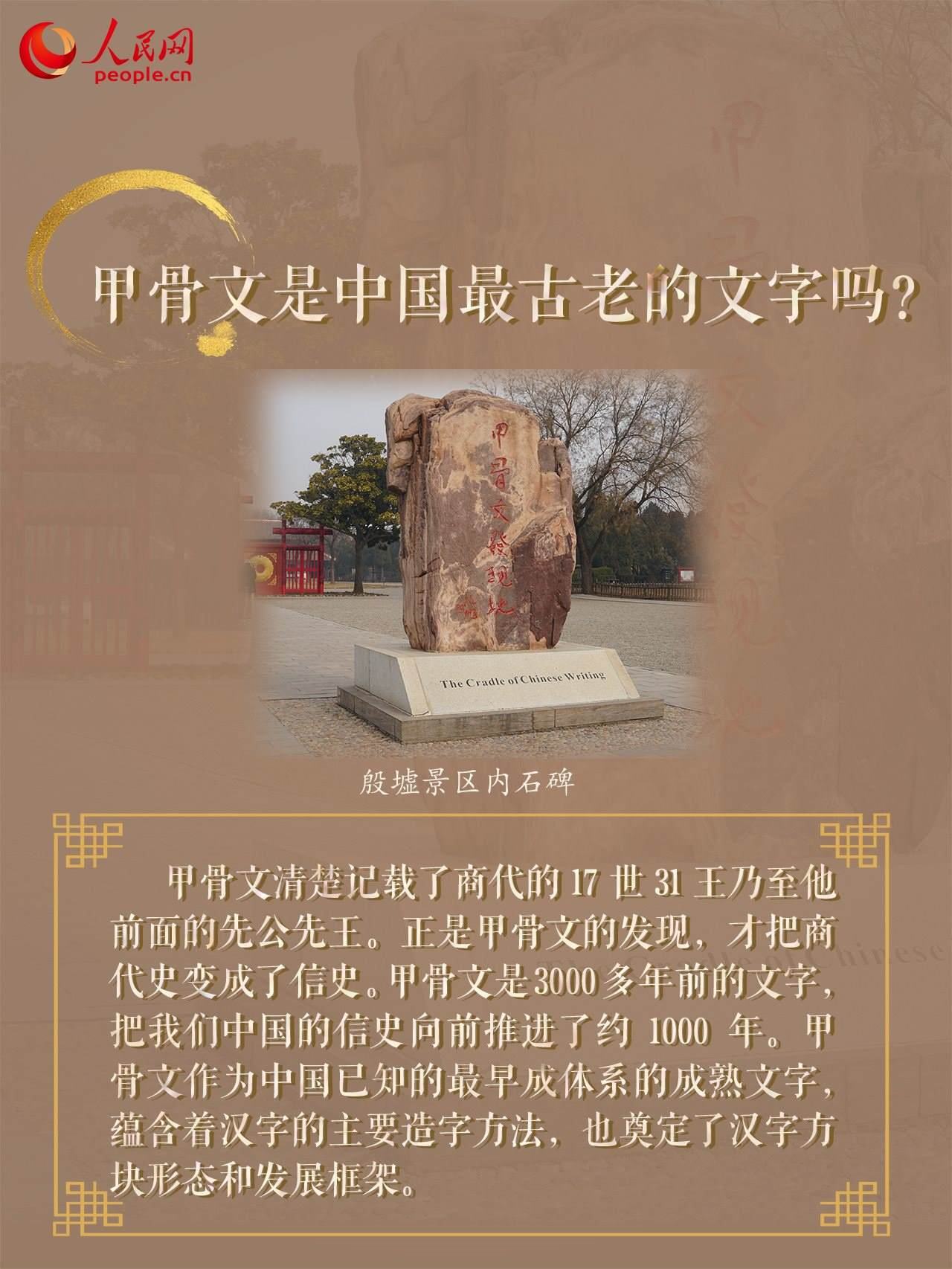 近日,由中央網(wǎng)信辦網(wǎng)絡(luò)傳播局指導(dǎo)的“寫意中國(guó)——探尋漢字起源”網(wǎng)上主題宣傳活動(dòng)正在開展。記者走進(jìn)位于河南安陽的殷墟遺址,一眼閱盡千年,探尋中華文明的古老密碼,感受遠(yuǎn)古甲骨文的獨(dú)特魅力。常說的“一片甲骨驚天下”指的是什么?什么地方被學(xué)術(shù)界譽(yù)為“中國(guó)最早的圖書館”?中國(guó)歷史上第一位巾幗女將軍是誰?跟隨記者實(shí)地探訪,一起來了解殷墟的文化密碼!