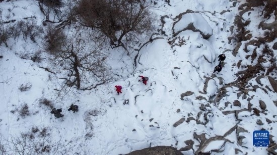 2月20日,在內(nèi)蒙古賀蘭山國(guó)家級(jí)自然保護(hù)區(qū),工作人員在山間跋涉(無人機(jī)照片)。